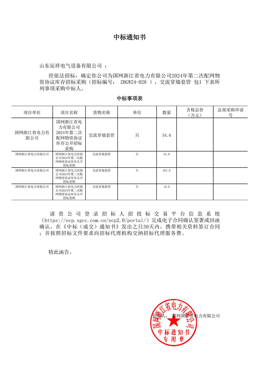 交流穿墻套管中標通知書